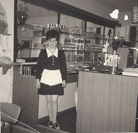 Mirella Mattiuz arbeitet in dem gemeinsam mit ihrem Mann betriebenen Eissalon Venezia in der Schiersteiner Reichsapfelstraße als Servicekraft und servierte nebe denbisher unbekannten Eisbechern auch italienischen Cappuccino. Auf der Fotografie ist sie neben der ausgestellten Kaffeemaschine und der zum Mahlen de Kaffees notwendigen Mühle zu sehen.